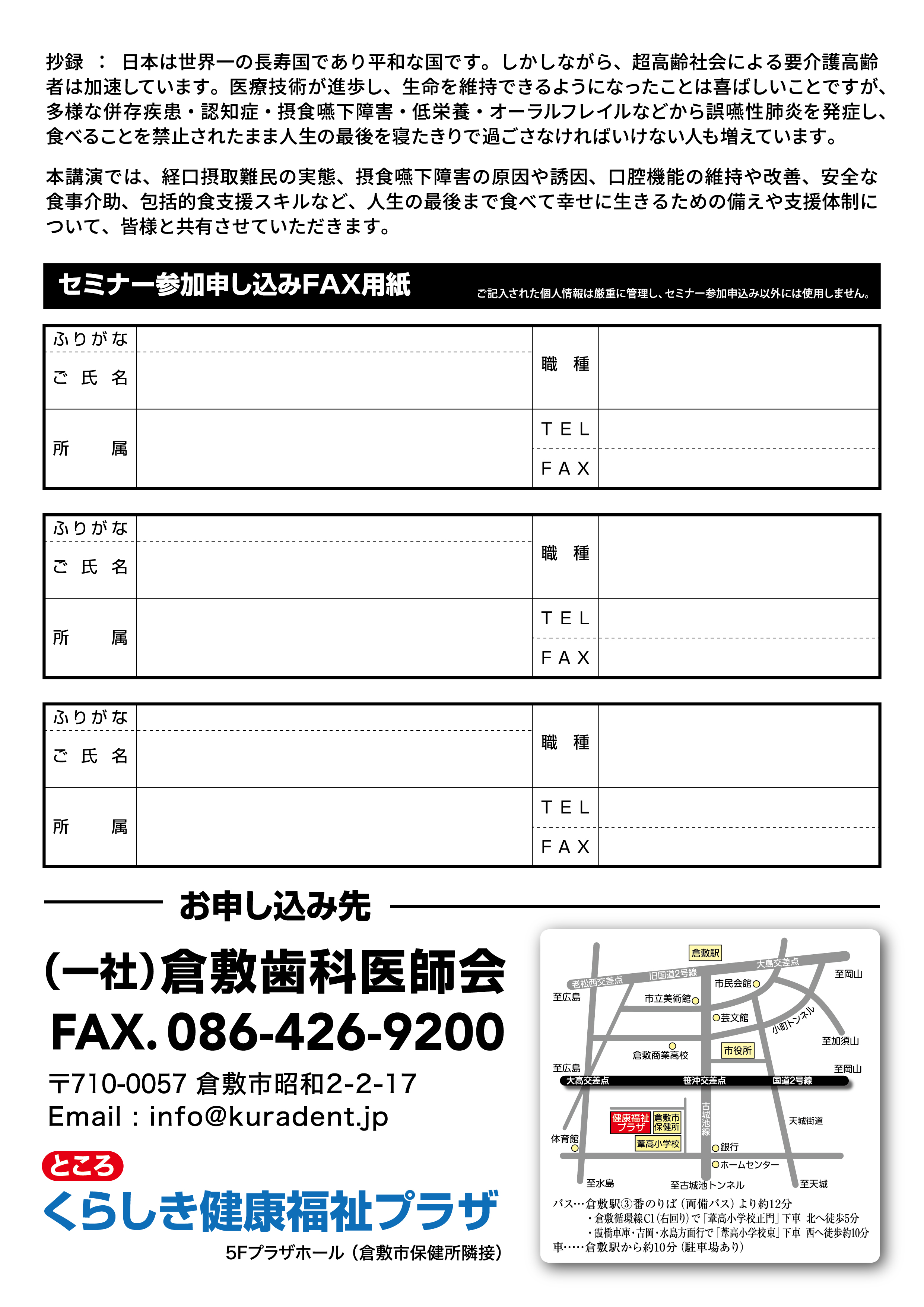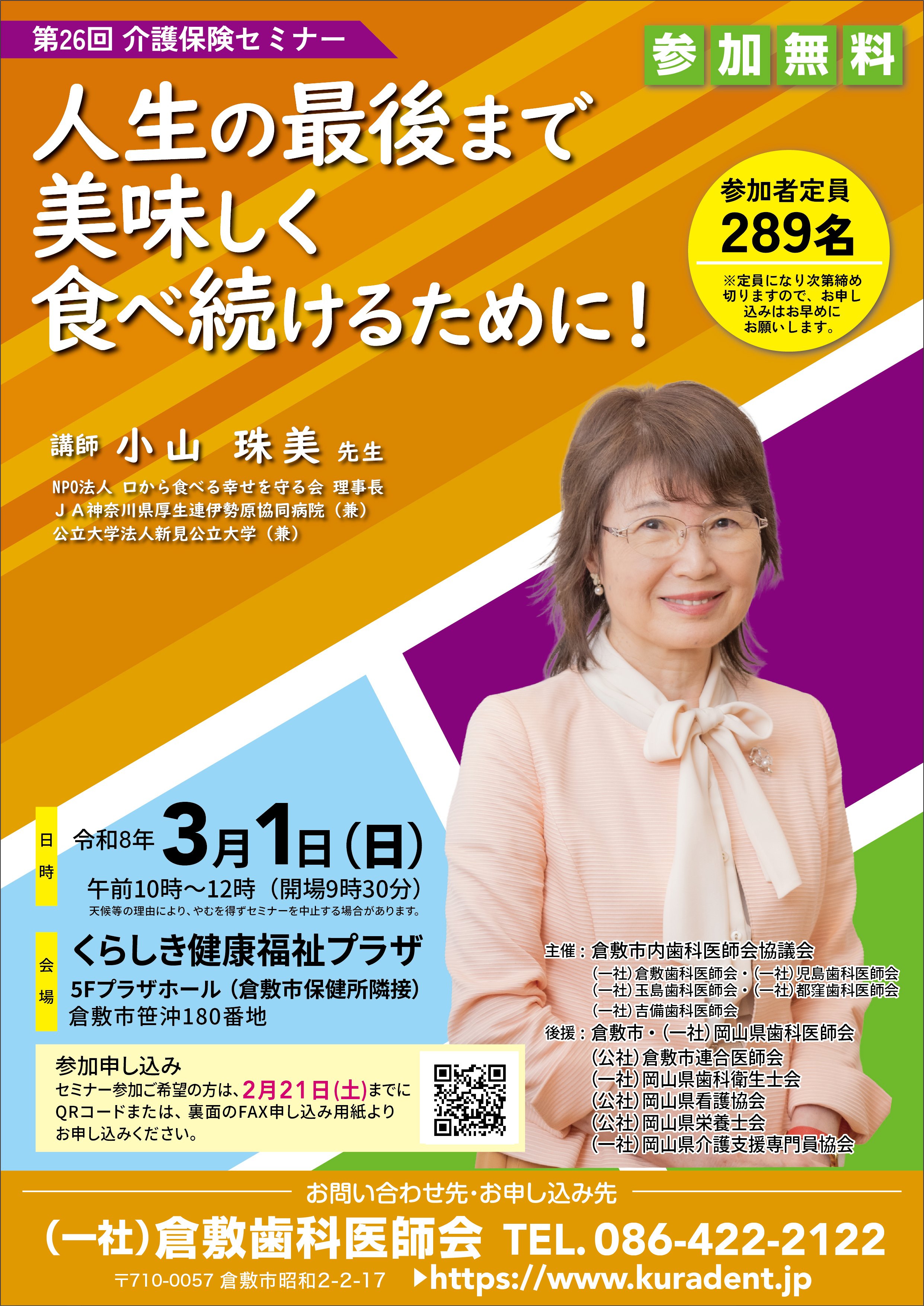令和8年3月1日(日曜日)に「第26回 介護保険セミナー」を開催いたします。今年度は、小山珠美さん(NPO法人 口から食べる幸せを守る会 理事長)を講師としてお招きし、『人生の最後まで美味しく食べ続けるために!』と題し、講演会を開催いたします。一般市民の誰でもご参加できます。もちろん『参加無料』でございますが、事前のお申込みをお願いいたします。なお、お申込み方法は下記お申込みクリックボタンか、QRコード、またはFAX(086-426-9200)にてお願いいたします。